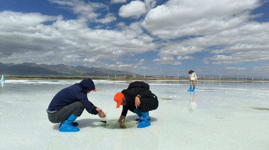 13日,科考隊(duì)員乘坐了5個(gè)小時(shí)的大巴,來(lái)到了茶卡鹽湖。茶卡鹽湖位于柴達(dá)木盆地烏蘭縣茶卡鎮(zhèn),是中國(guó)四大鹽湖之一。進(jìn)入茶卡鹽湖,由于湖上基本都有水,科考隊(duì)員們都穿上了水桶鞋,在鹽湖深處各鹽穴區(qū)域取樣。