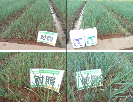 效果說明:在大蒜苗期使用歐神微生物菌劑+葉色美能明顯促進葉片生長,試驗組葉片厚度幾乎是對照的兩倍