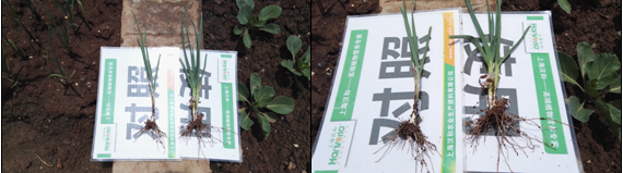 效果說明與常規對比,試驗組的大蒜植株根系較對照多、粗、長,且新生白根較多。
